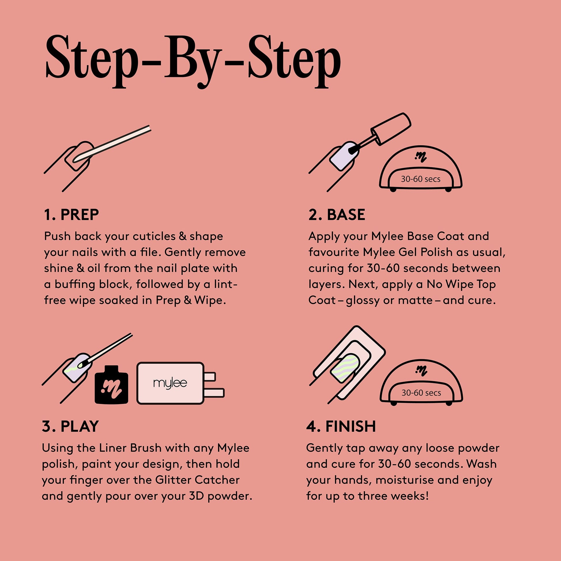 Elevate your nail game and bring your creations to life with precision and definition using The Mylee 3D Nail Art Kit. Use the fine 9mm Liner Brush in combination with your preferred Mylee Gel Polish to craft intricate designs. Effortlessly apply the 3D Powder over your nails, and our innovative Glitter Catcher ensures there's no spillage or wastage.