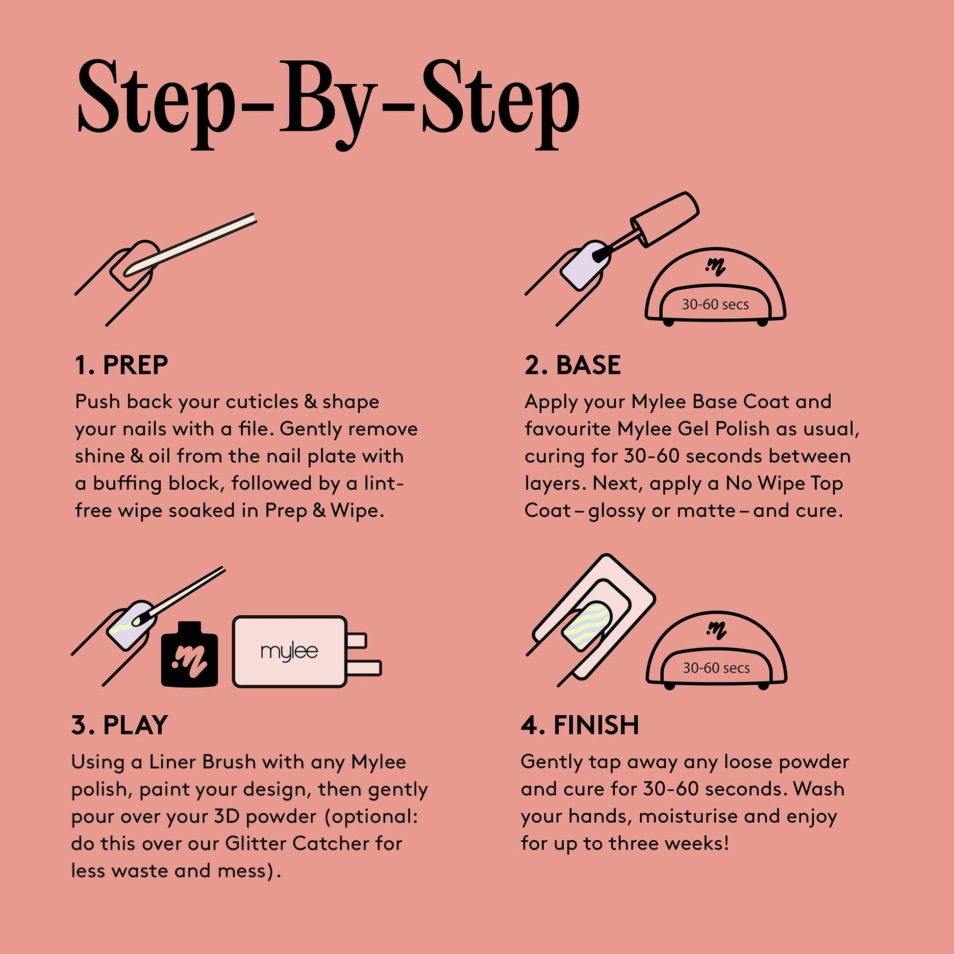Mylee Gel Polish and a Liner Brush to craft intricate designs, then effortlessly apply the 3D Nail Art Powder
