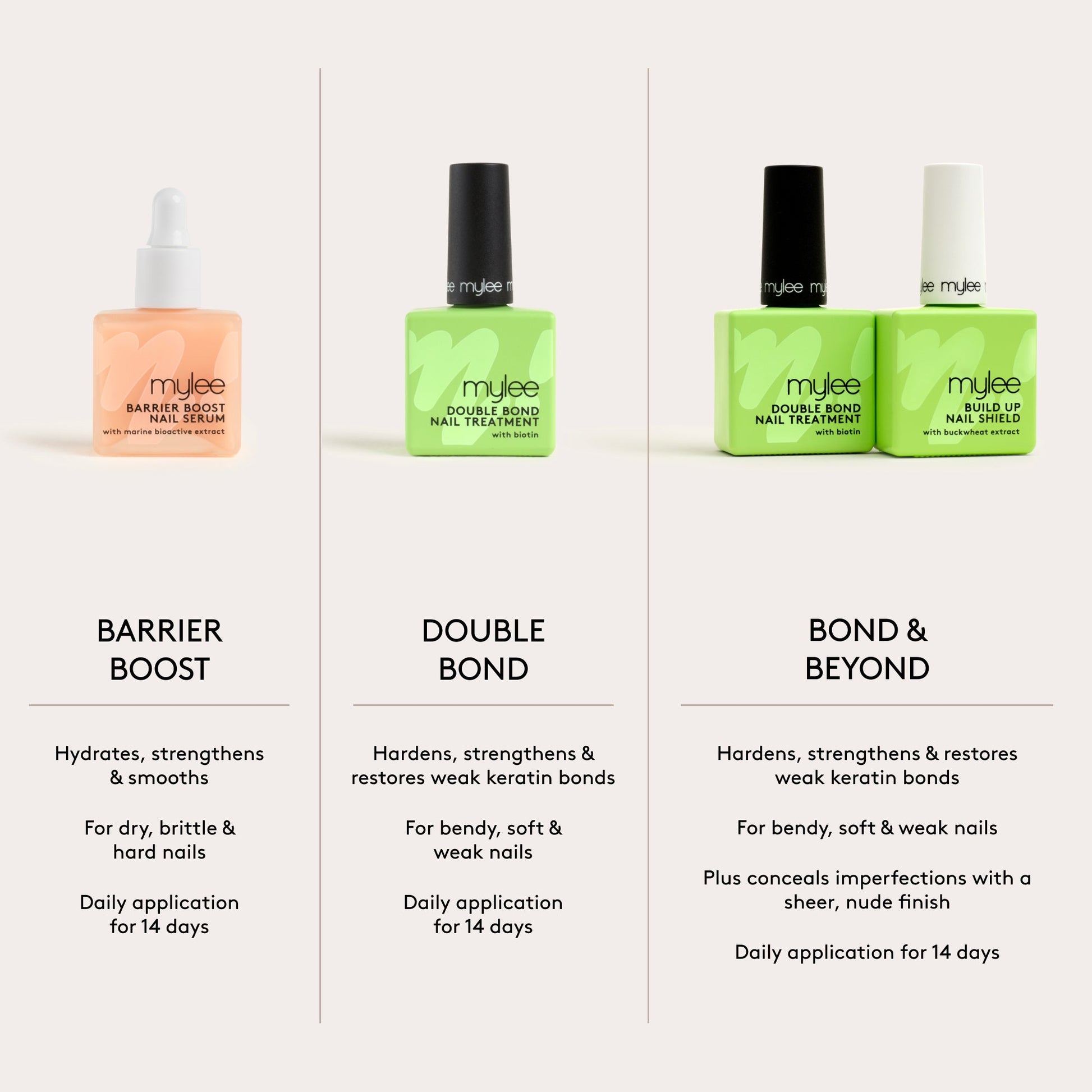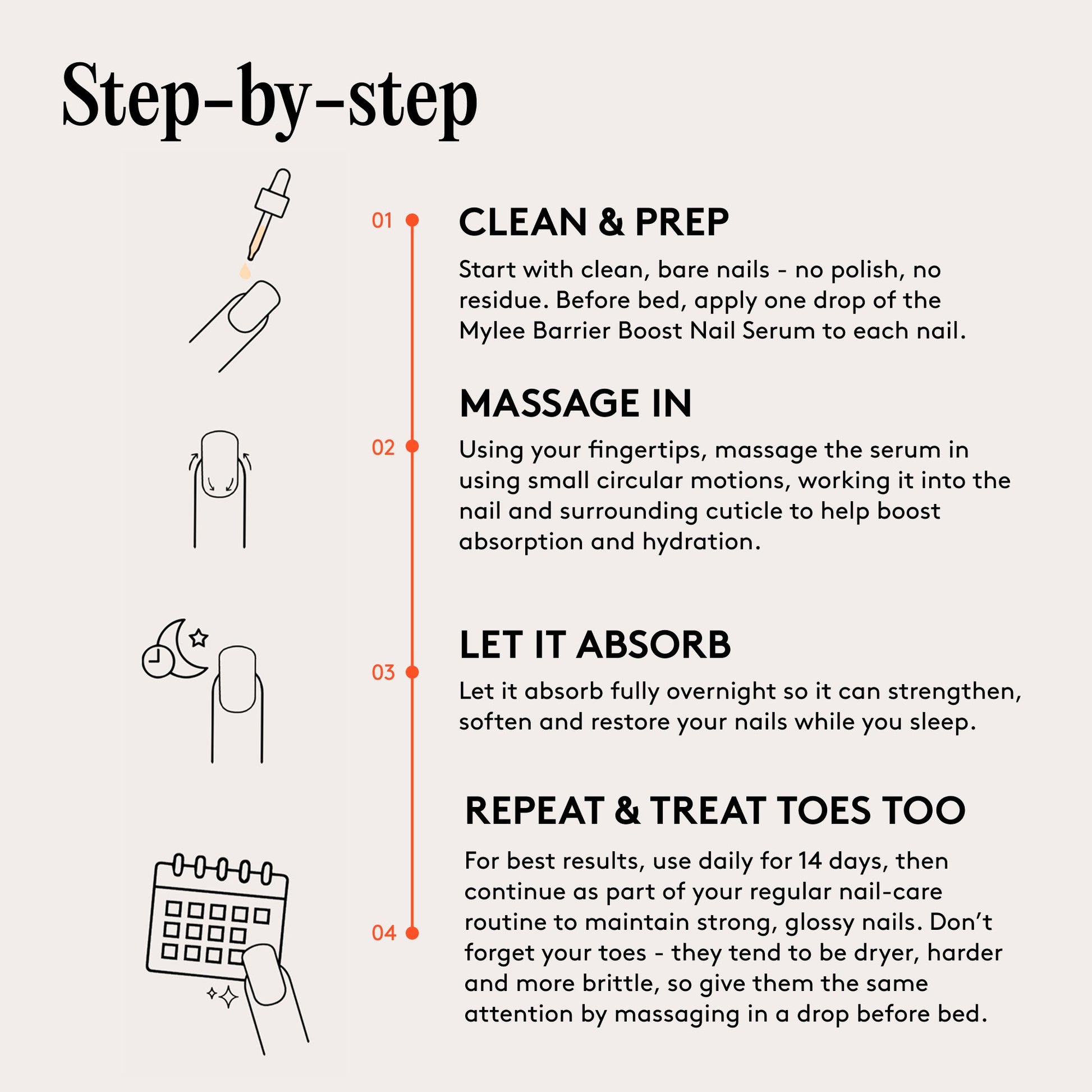 Start with clean, bare nails - no polish, no residue. Before bed, apply one drop of the Mylee Barrier Boost Nail Serum to each nail.
