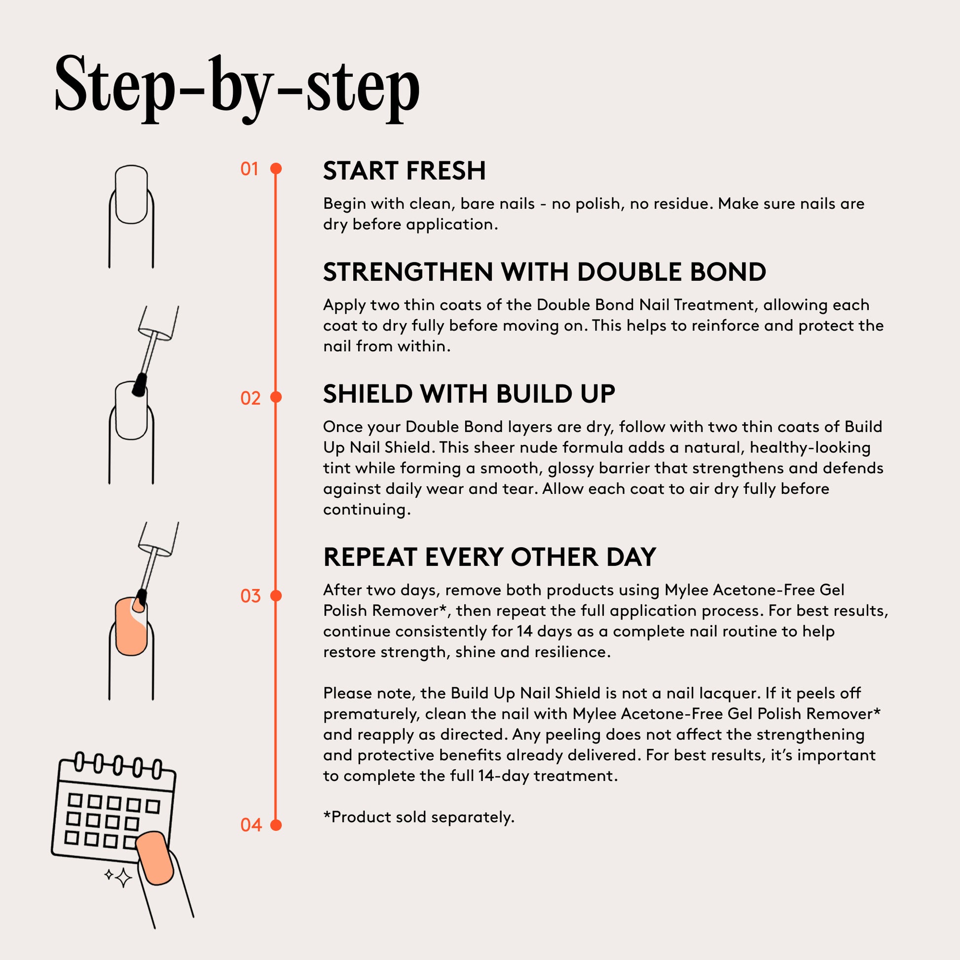 **Please note, the Build Up Nail Shield is not a nail lacquer. If it peels off prematurely, clean the nail with Mylee Acetone-Free Gel Polish Remover* and reapply as directed. Any peeling does not affect the strengthening and protective benefits already delivered. For best results, it’s important to complete the full 14-day treatment.