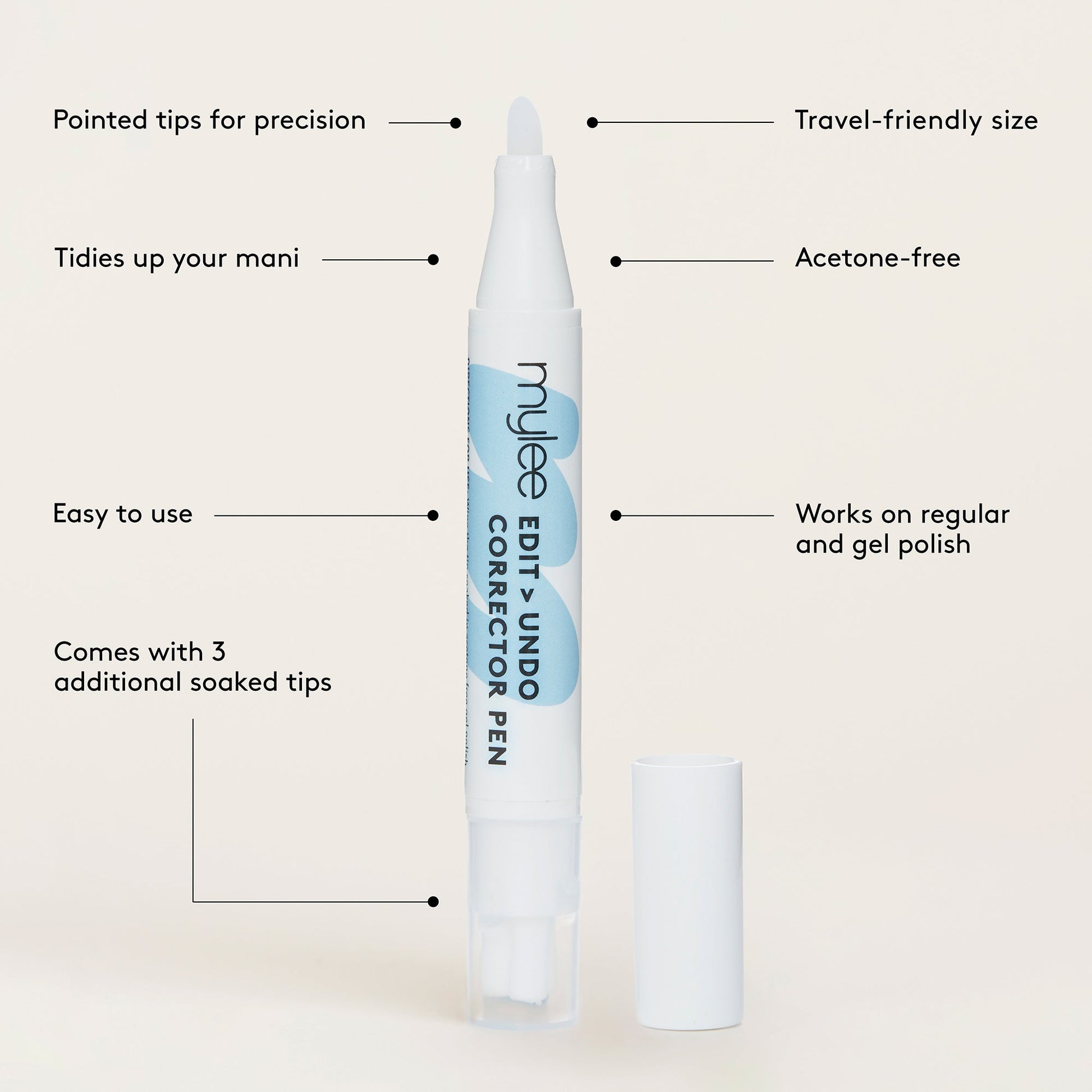 - Precision acetone-free tip (+ 3 spares) for precise corrections.