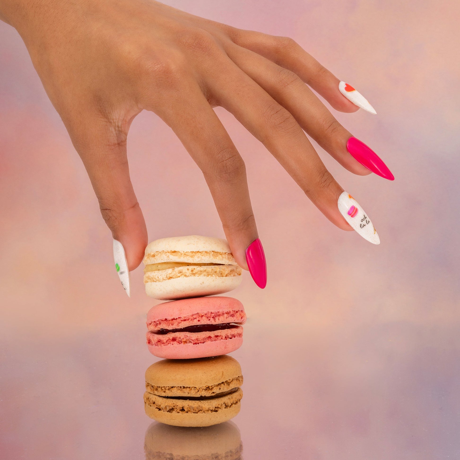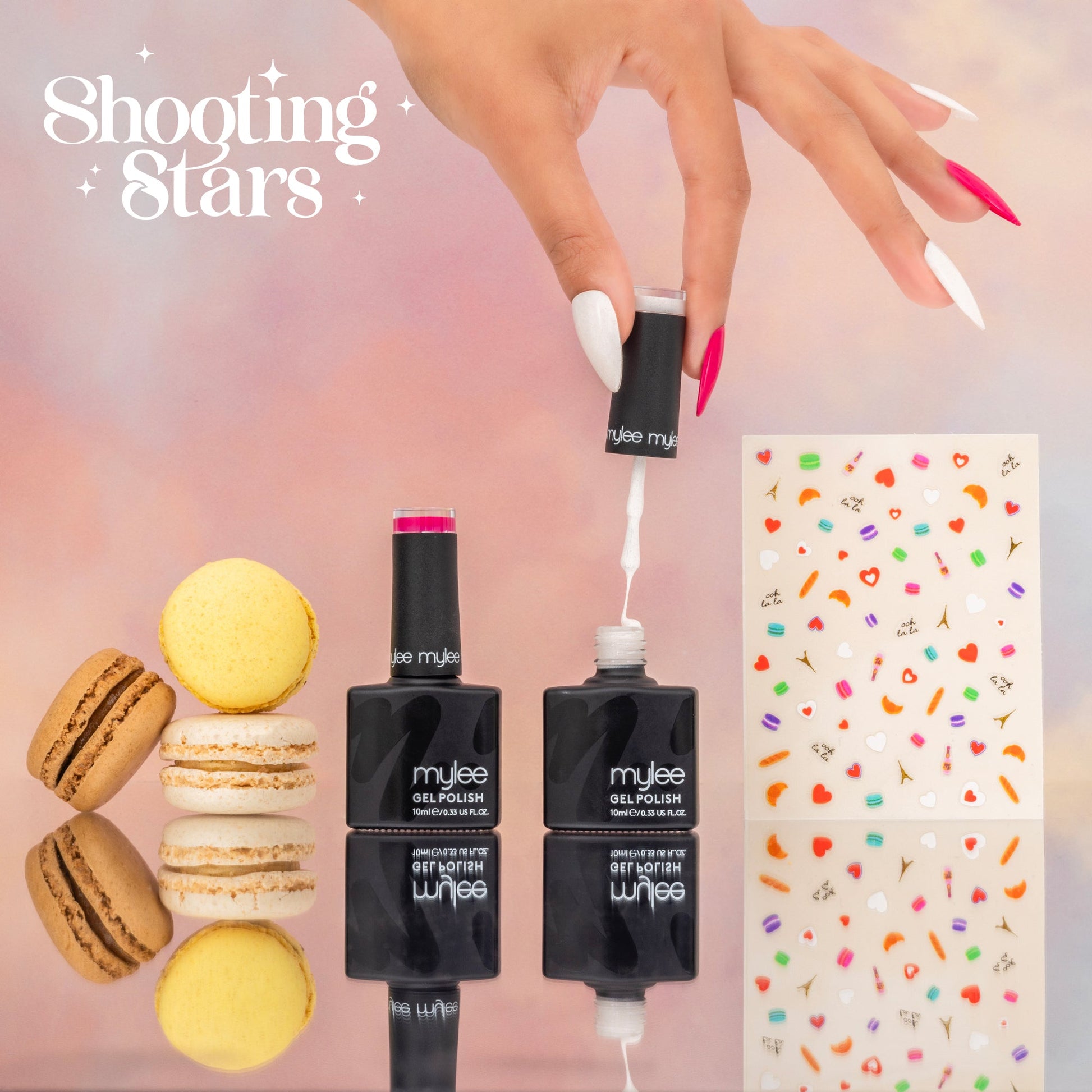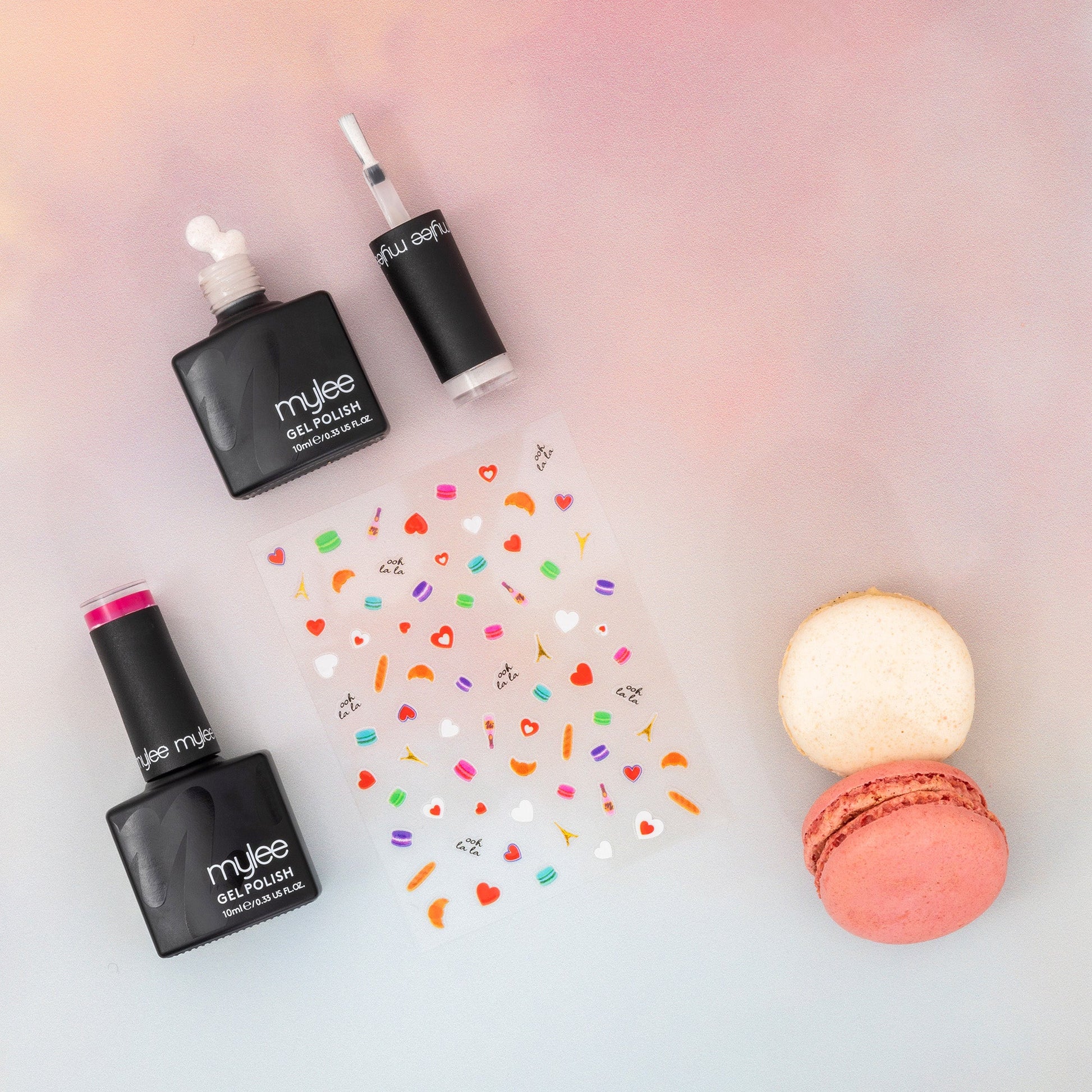 Dive into the Parisian love affair with the Mylee In Paris Gel Polish Duo! Let Amélie's hot pink hue whisk you away to the bustling Seine, then bask in the refined charm of Soufflé's creamy speckles. Elevate your mani game with adorable Parisian-themed Nail Stickers, turning your nails into a très chic trio.
