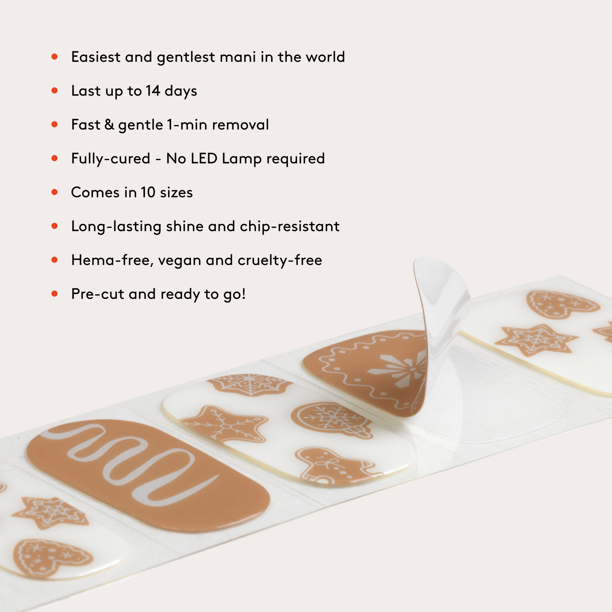 Soft, sweet, and oh-so-snuggly. The Snow Dough Gel Nail Wraps combine white and gingerbread brown nail art for a warm wintery look. Just peel, stick, shape, and go - these wraps last up to 14 days with a salon-quality finish.