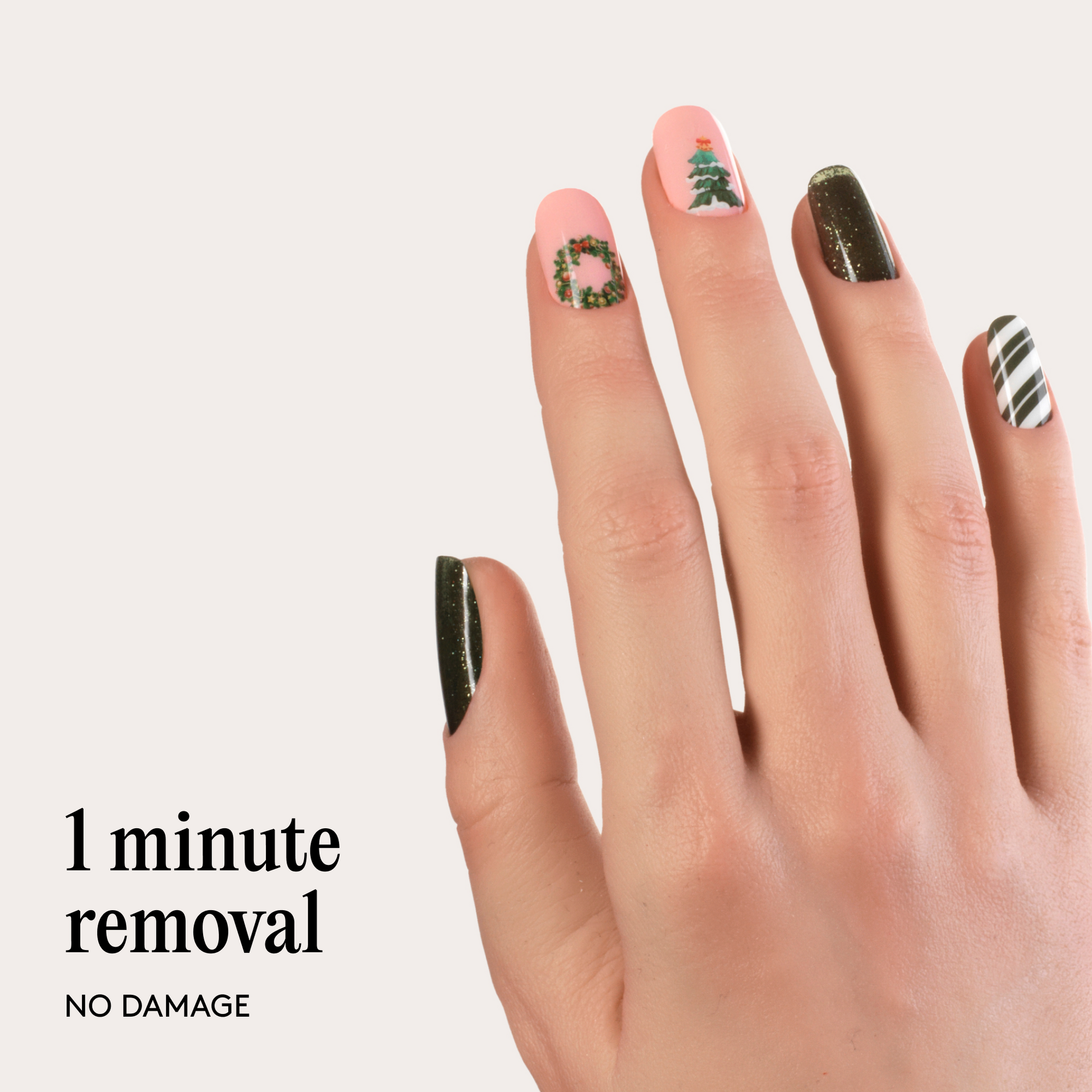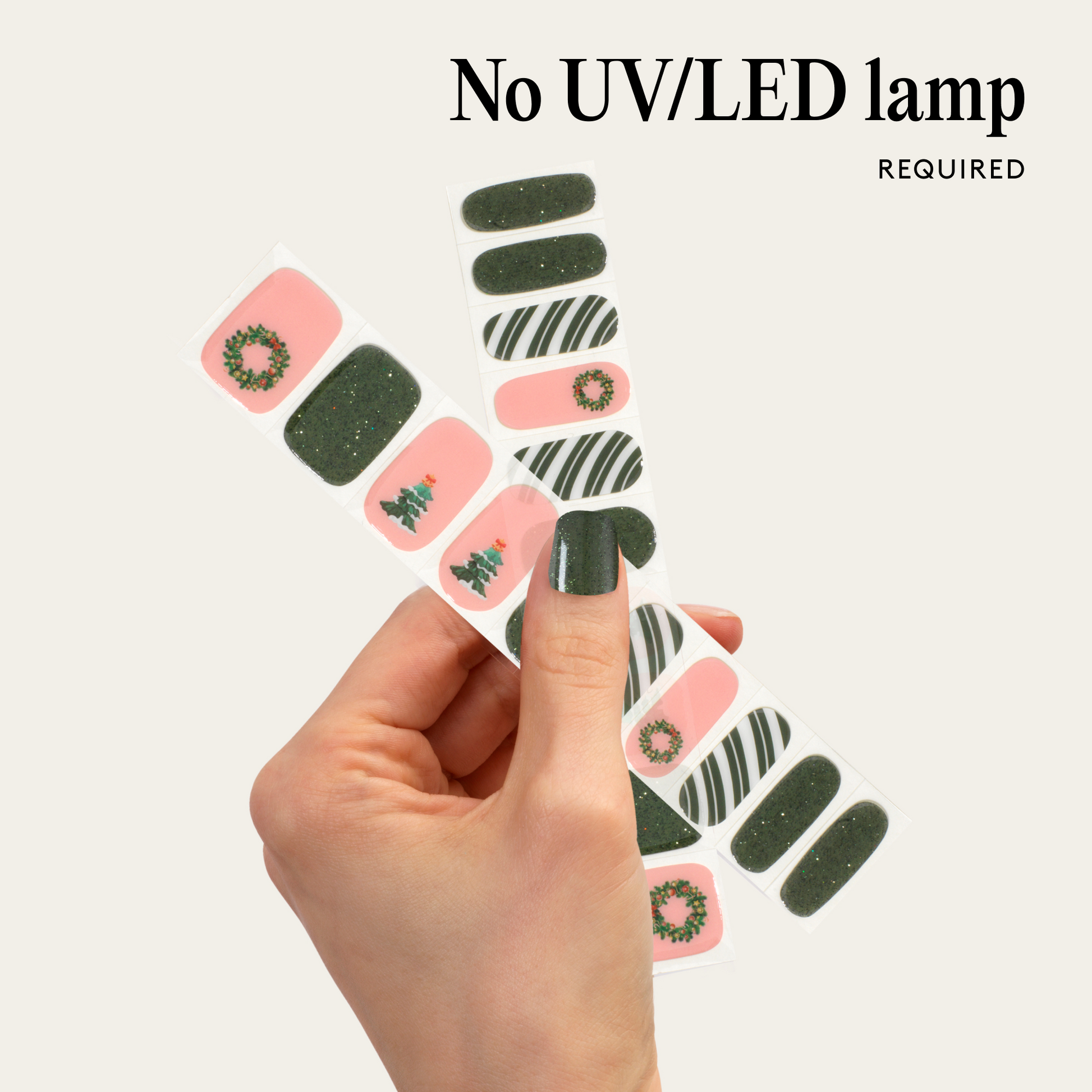 Perfect for every party from mulled wine meet-ups to New Year’s Eve countdowns, the Wreath & Repeat Gel Nail Wraps are a mix of sparkle, colour, and holiday magic. Featuring sparkly dark green, crisp white-and-green stripes, and baby pink nails adorned with wreaths and Christmas tree nail art, this set brings a full-on festive mood to your fingertips. Just peel, stick, shape, and go - these wraps last up to 14 days with a salon-quality finish.