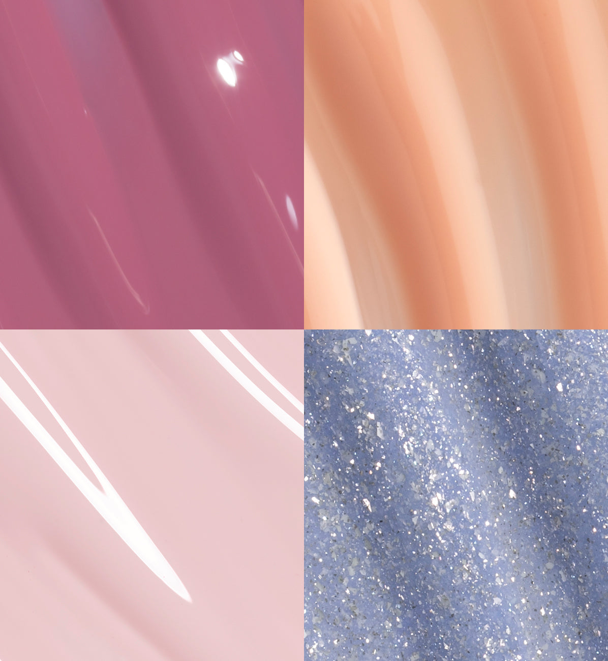 Bundle includes: Vintage Rose - deep dusky rosey pink, Get It On - warm peach colour for a medium skin shade with a light coral undertone, Pastel Chic - classic pastel pink & Odyssey - lilac glitter nail polish.
