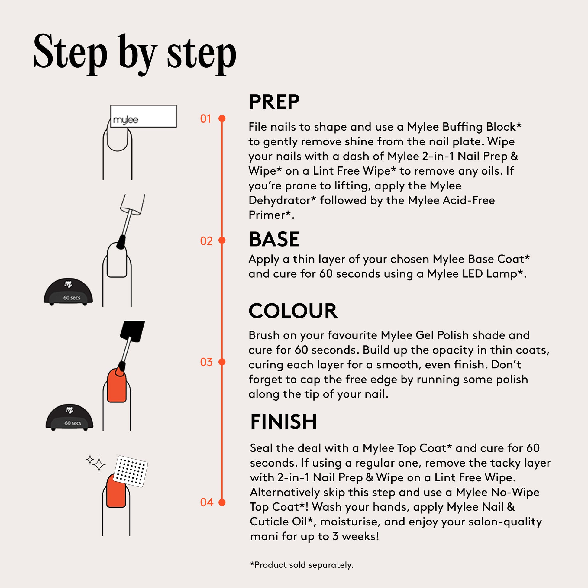 File nails to shape and use a Mylee Buffing Block* to gently remove shine from the nail plate. Wipe your nails with a dash of Mylee 2-in-1 Nail Prep & Wipe* on a Lint Free Wipe* to remove any oils.