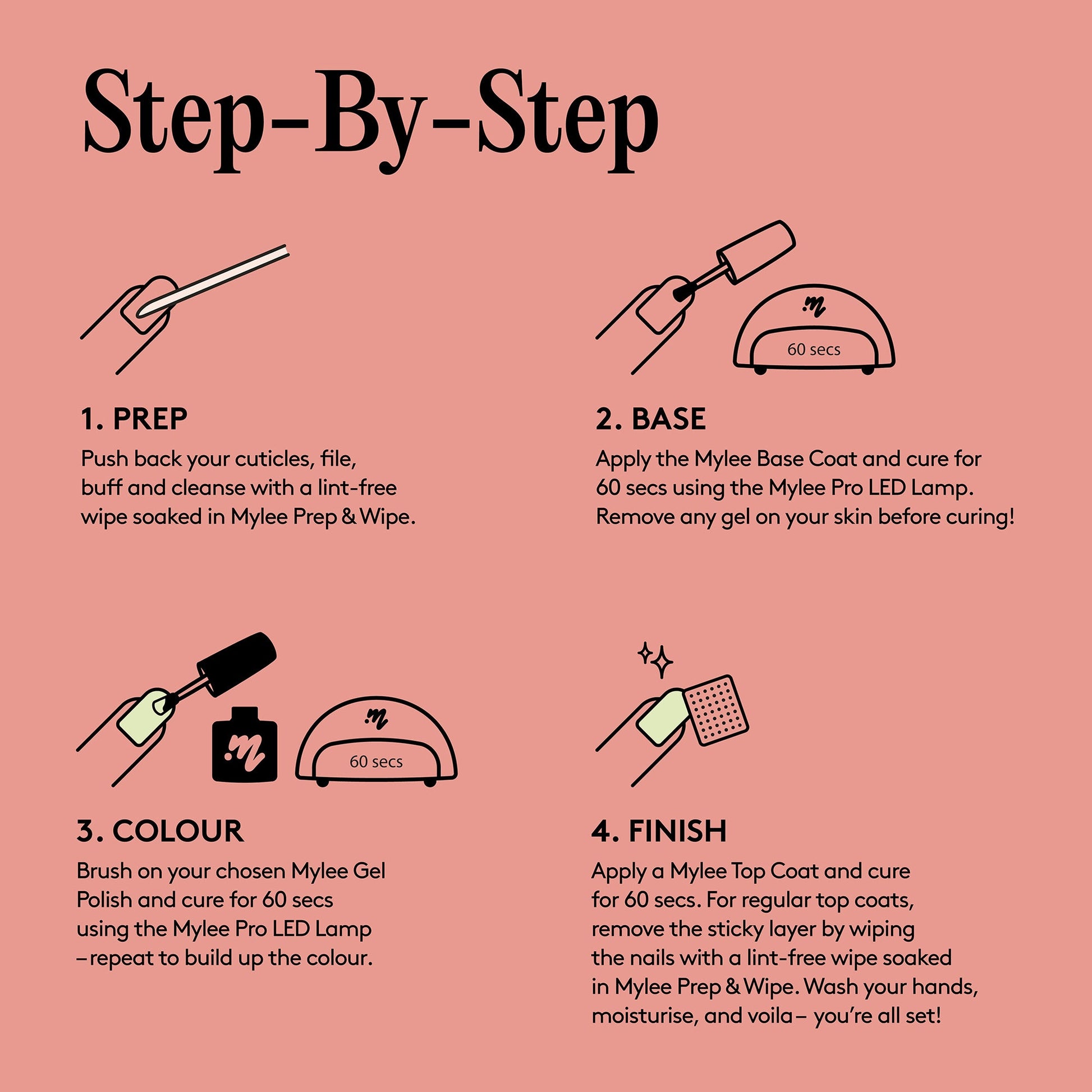 Seal the deal with a Mylee Top Coat* and cure for 60 seconds. If using the regular Mylee Top Coat, remove the tacky layer with 2-in-1 Nail Prep & Wipe on a Lint Free Wipe. Alternatively skip this step and use a Mylee No-Wipe Top Coat! Wash your hands, apply Mylee Nail & Cuticle Oil*, moisturise, and enjoy your salon-quality mani for up to 3 weeks!