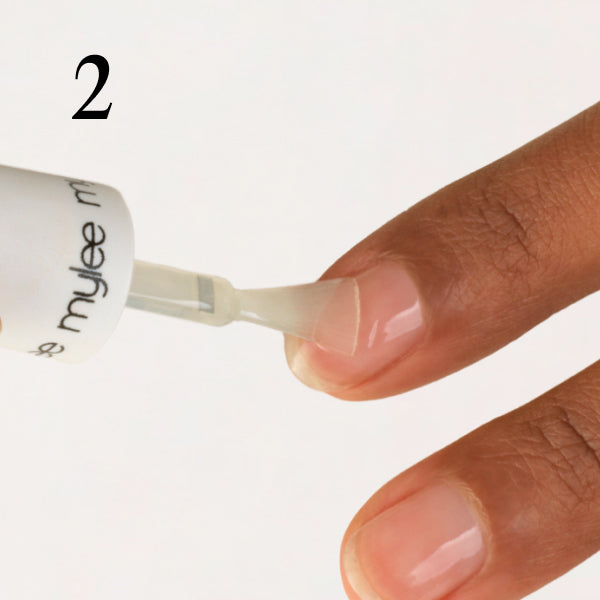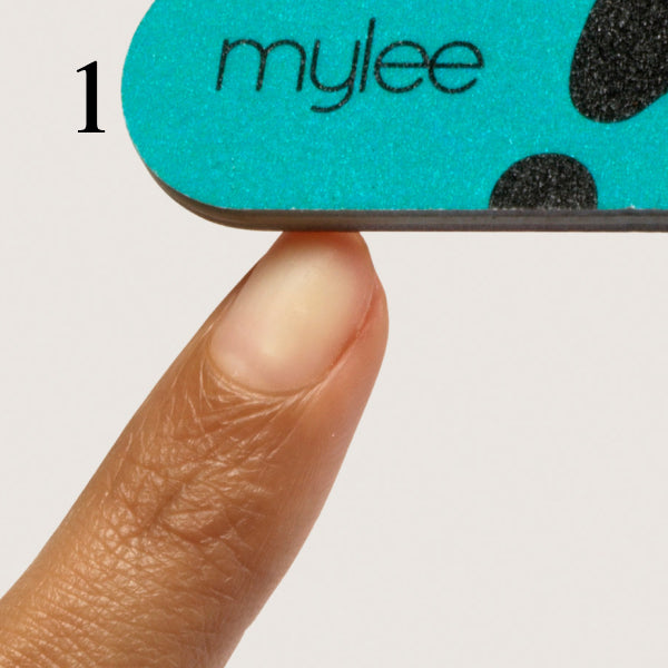 File nails to shape and use a Mylee Buffing Block* to help gently remove shine from the nail plate. Wipe your nails with a dash of Mylee 2-in-1 Nail Prep & Wipe* on a Mylee Lint Free Wipe* to remove any oils. If you’re prone to lifting, apply the Mylee Dehydrator* followed by the Mylee Acid-Free Primer*.