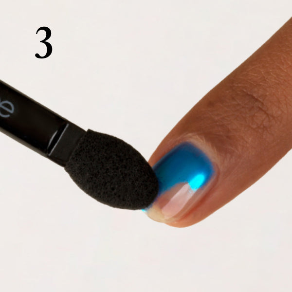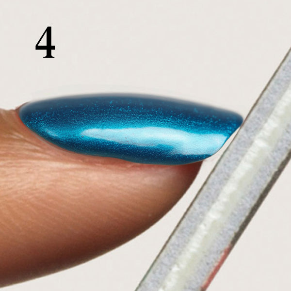 Apply a layer of Mylee No Wipe Top Coat* and cure for 60 seconds. Using the applicator, gently buff your chosen chrome pigment onto the nail until you achieve a mirror finish. After applying the pigment, use a nail file to lightly buff around the free edge of each nail. This removes excess pigment, helps the top coat adhere better, and prevents lifting.