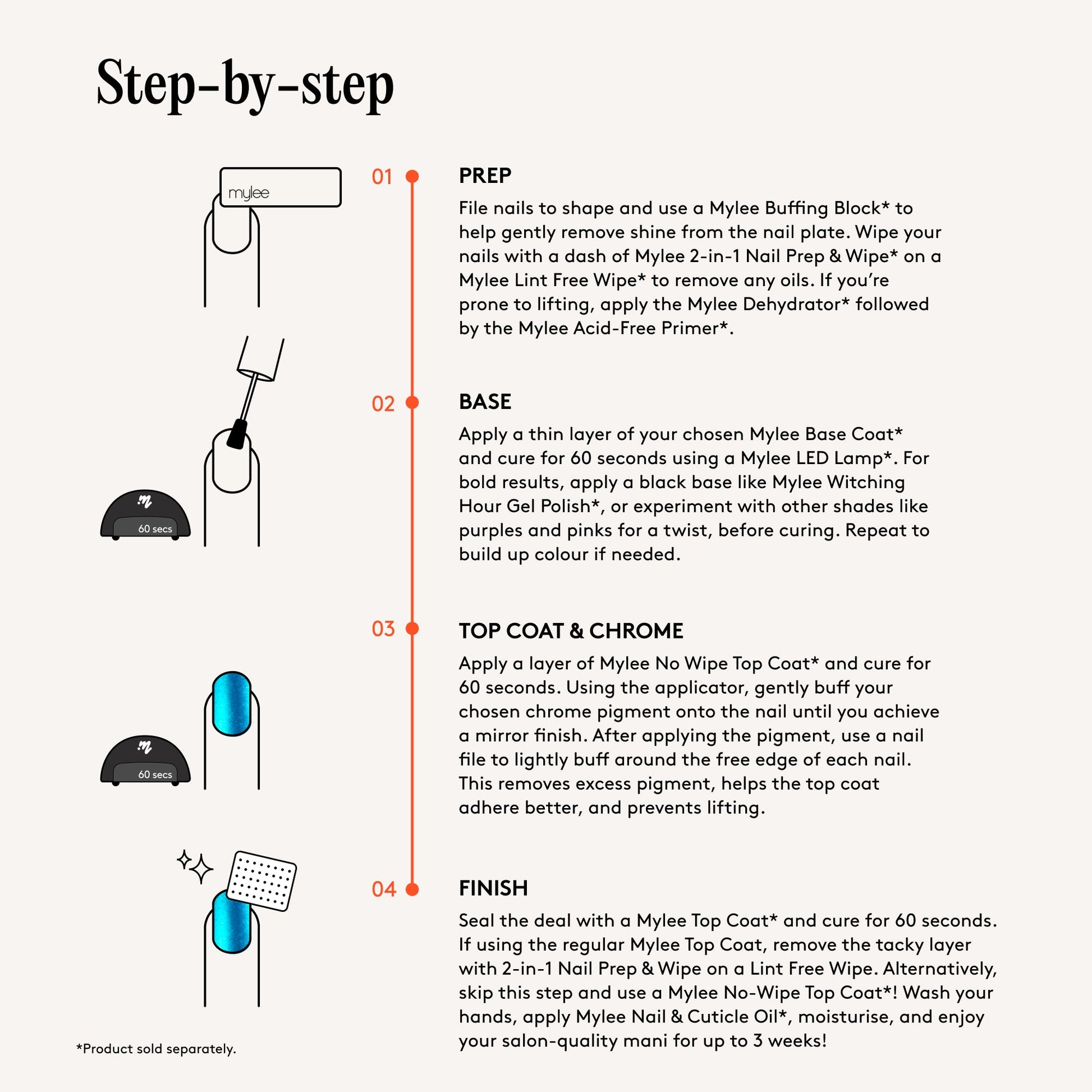 Seal the deal with a Mylee Top Coat* and cure for 60 seconds. If using the regular Mylee Top Coat, remove the tacky layer with 2-in-1 Nail Prep & Wipe on a Lint Free Wipe. Alternatively, skip this step and use a Mylee No-Wipe Top Coat*! Wash your hands, apply Mylee Nail & Cuticle Oil*, moisturise, and enjoy your salon-quality mani for up to 3 weeks!