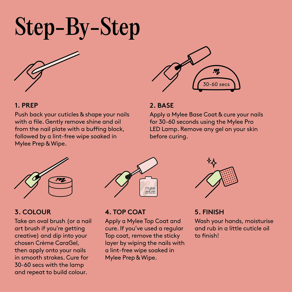 - Our Base Coat Gel Polish is the secret to long-lasting wear - especially when using Crème CaraGel. It helps your mani stay put for up to 3 weeks, so don’t skip it. Apply a thin, even coat and cure before moving on.