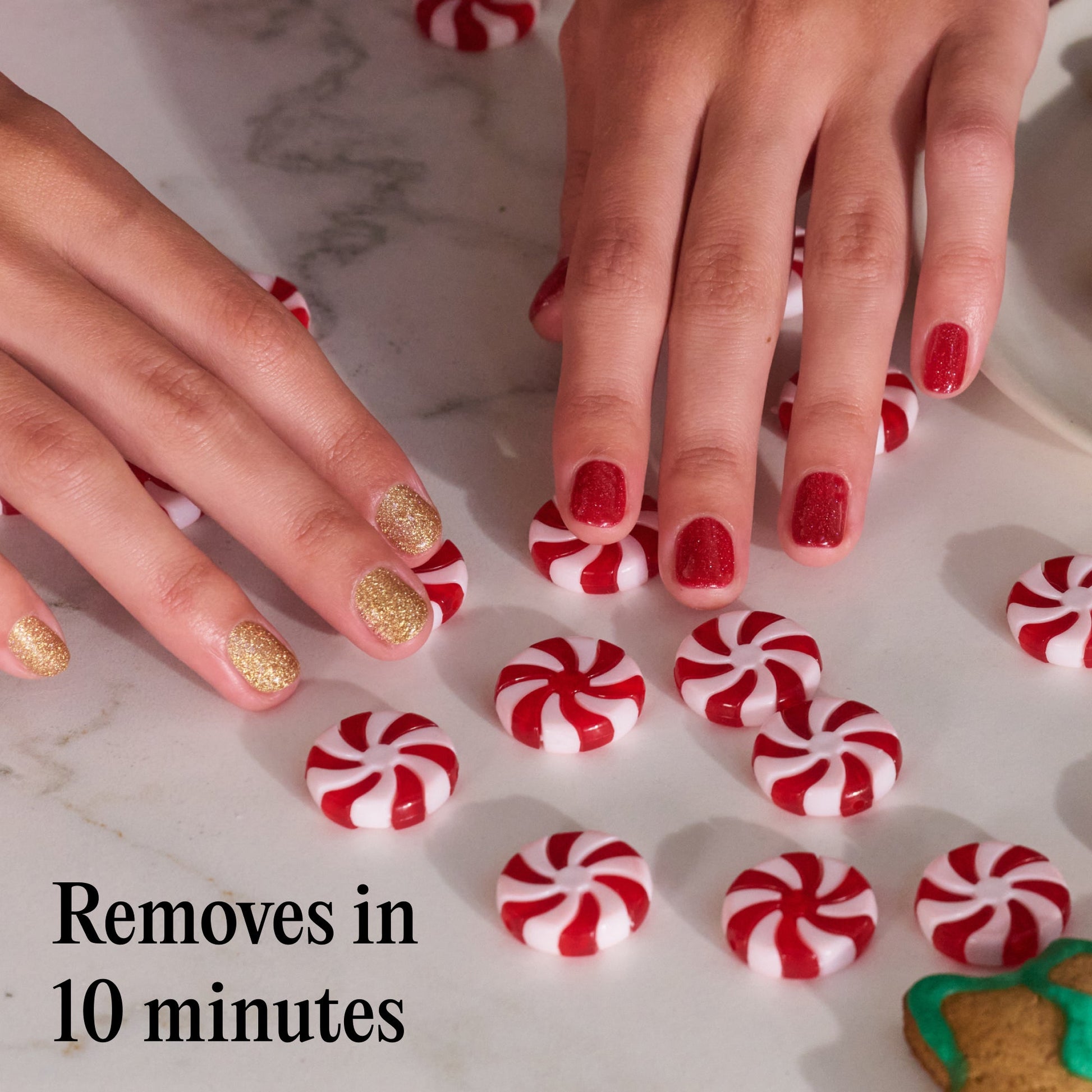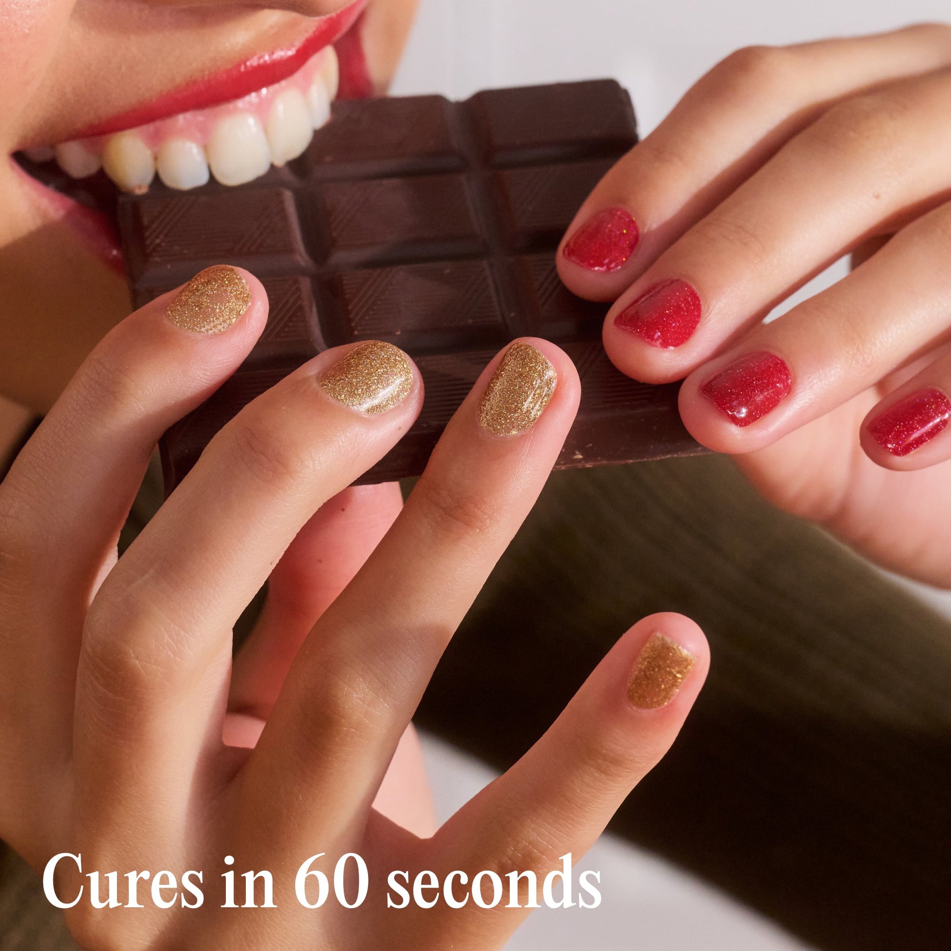 All wrapped up and ready to shine! The Quality Treats Duo is a double dose of festive sparkle with Candy Cane Crush, a glittering holographic ruby red, and Honeycomb Glow, a bold holographic gold. Together, these Gel Polishes are your go-to for nails that look as sweet as they sound. Each of our shades cures in 60 seconds and stays glossy, chip-free, and salon-fresh for up to 3 weeks.