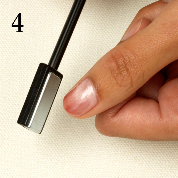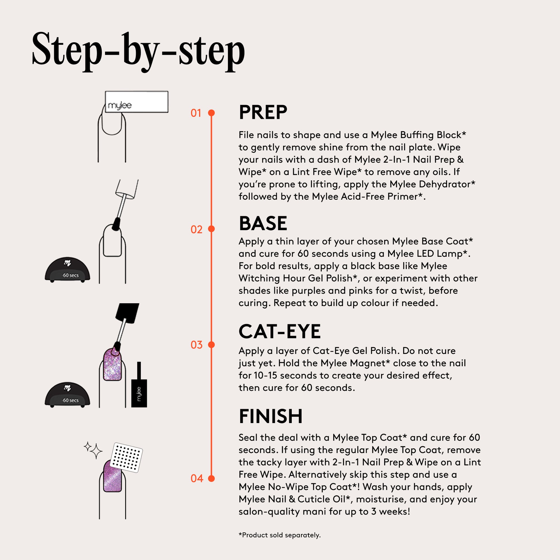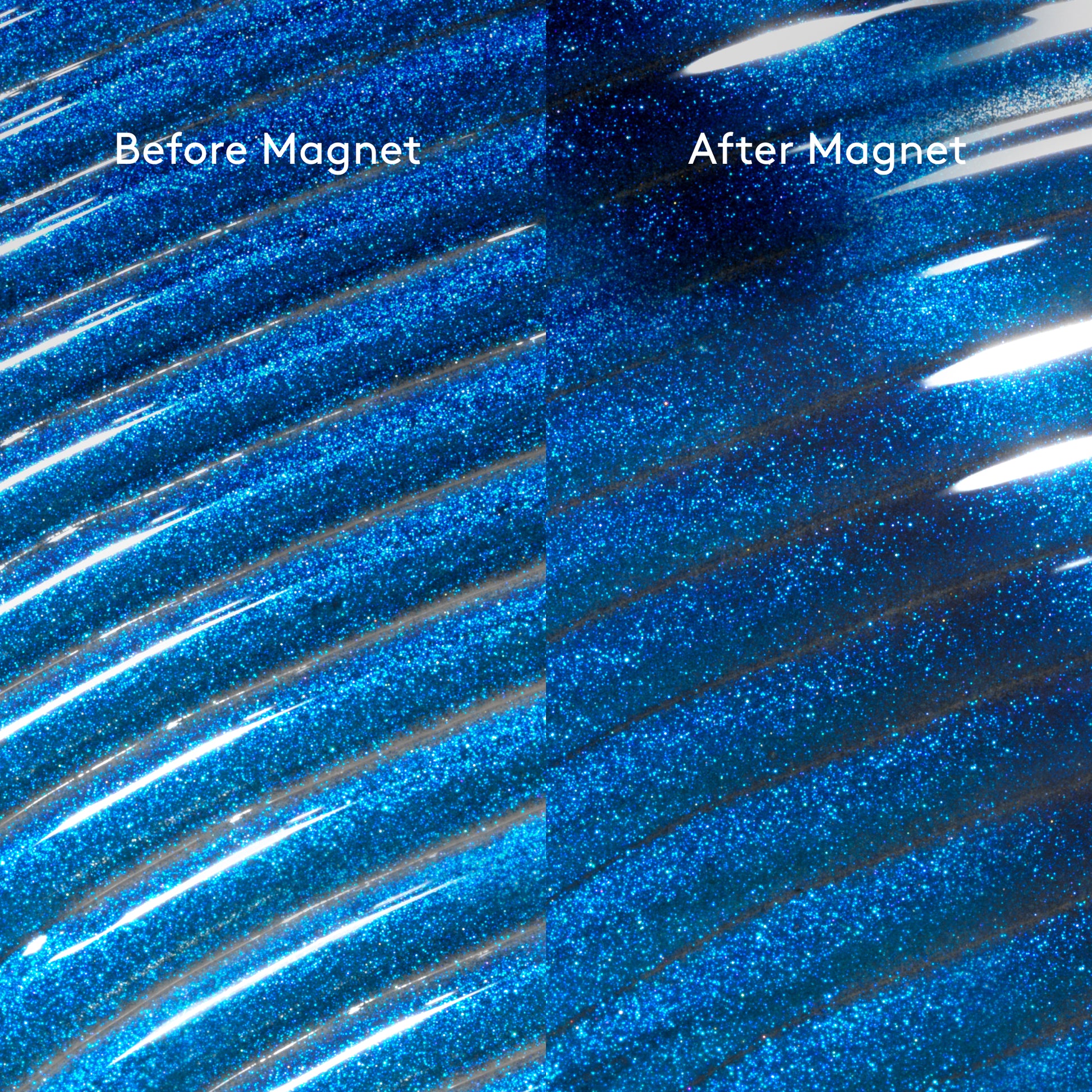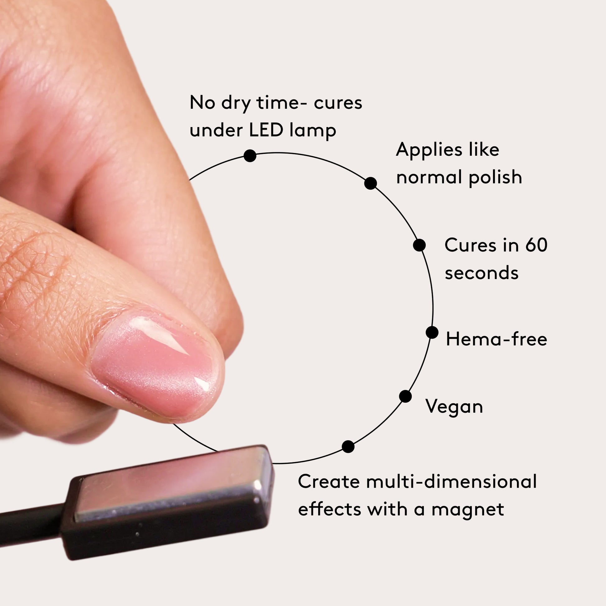 Apply a layer of Cat-Eye Gel Polish. Do not cure just yet. Hold the Mylee Magnet* close to the nail for 10-15 seconds to create your desired effect, then cure for 60 seconds.
