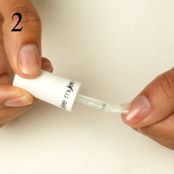 File nails to shape and use a Mylee Buffing Block* to gently remove shine from the nail plate. Wipe your nails with a dash of Mylee 2-in-1 Nail Prep & Wipe* on a Lint Free Wipe* to remove any oils. If you’re prone to lifting, apply the Mylee Dehydrator* followed by the Mylee Acid-Free Primer*.