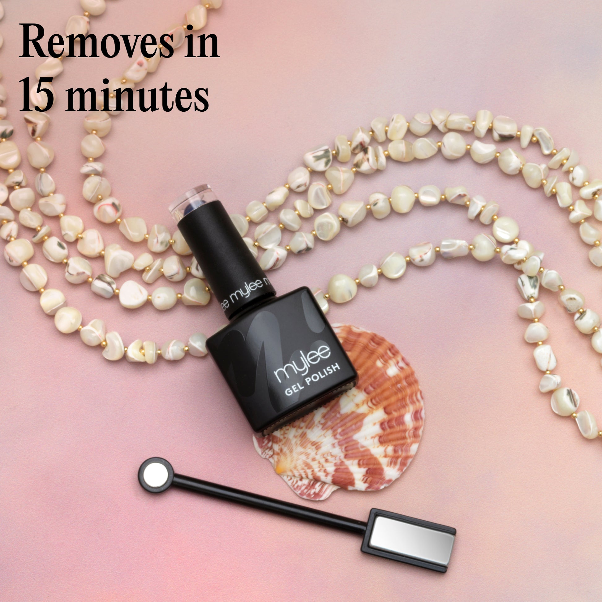 Meet the Sea Sirens Cat-Eye Gel Polish Quad. Four magnetic shades designed to shift and catch the light with every movement. Golden Sunsets is a shimmering golden orange with a radiant, molten finish. Pink Sands is a rustic pink with a soft, glowing shimmer. Moonlit Beach is a cool, reflective silver with a clean metallic sheen. High Tide is an electric cobalt blue with bold, multi-dimensional depth. With the Mylee Magnet Duo included, your nails will glisten like ocean treasures. Each shade cures in 60 seconds and stays glossy and chip-free for up to 3 weeks. Simply use a magnet to create the signature cat-eye effect.