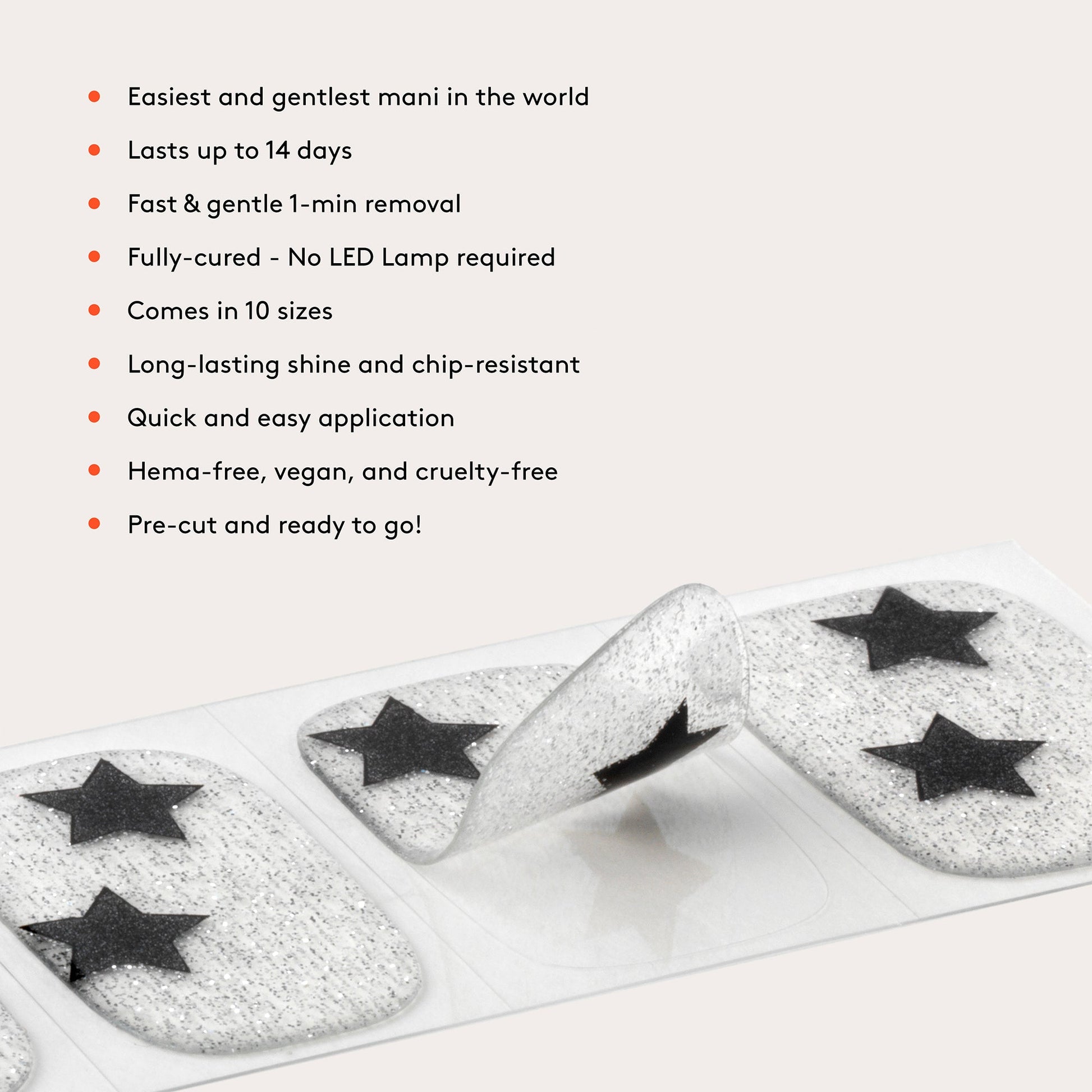 Silver sparkle and jet-black stars? It’s giving headline act. These Gel Nail Wraps were made for festival season - glittering under stage lights, twinkling in the crowd, and turning every wave of your hand into a moment. With zero drying time and up to 14 days of chip-free wear, you can dance ‘til dawn without a single smudge. Just peel, stick, shape - and you’re ready to rock.