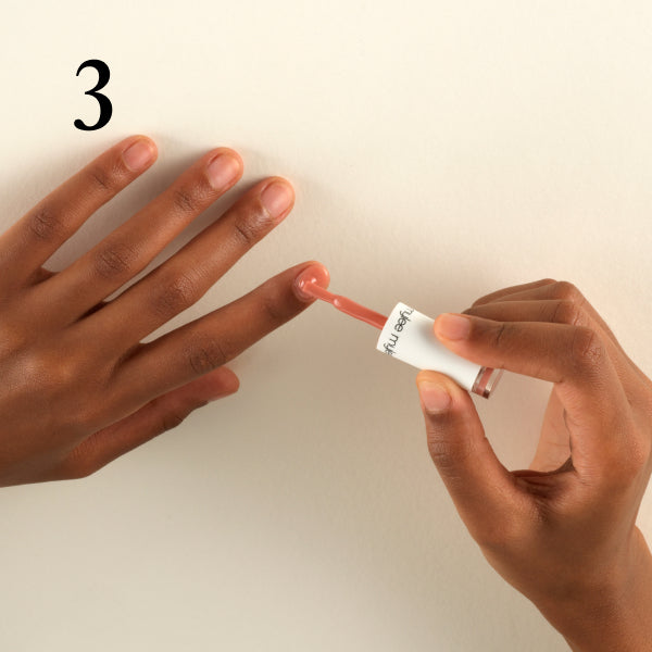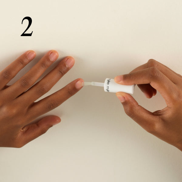 File nails to shape and use a Mylee Buffing Block* to help gently remove shine from the nail plate. Wipe your nails with a dash of Mylee 2-in-1 Nail Prep & Wipe* on a Mylee Lint Free Wipe* to remove any oils. If you’re prone to lifting, apply the Mylee Prep Dehydrator* followed by the Mylee Acid-Free Primer*.