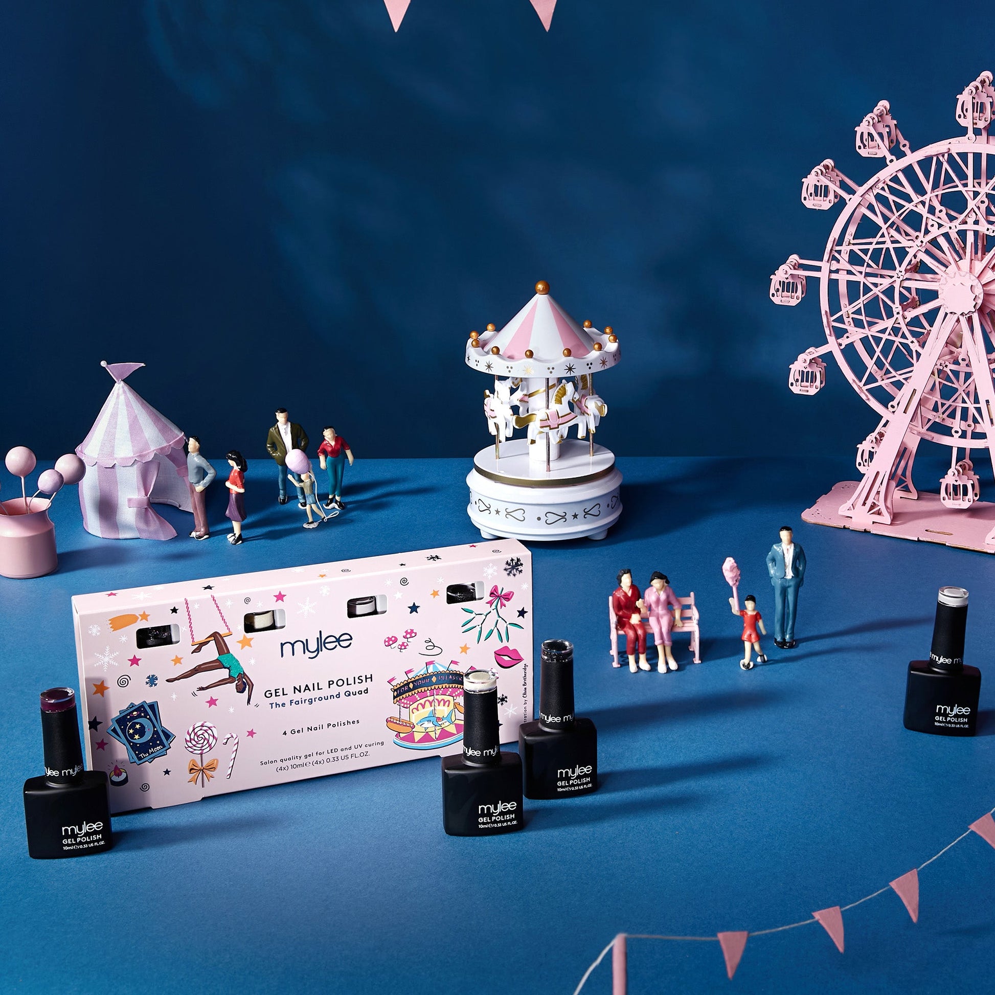 Behold The Fairground Quad. This lively collection of gel polishes range from purpley off-white Merry-Go-Round to the rich plum of Kissing Booth. For something with a little more sparkle, we've included the glittery gold Sugar Rush and captivating black Tarot Reader which features holographic glitter. Immerse yourself in our winter carnival extravaganza!