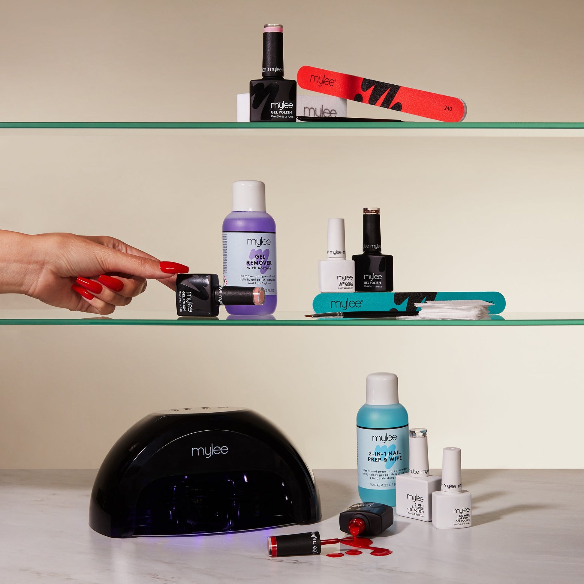 The Mylee Main Kit is your ultimate tool for achieving flawless, salon-quality manicures at home. Perfect for both nail pros and beginners, this kit is packed with everything you need to level up your nail game. Featuring four vibrant Gel Polishes, pick from two different colour options - it’s time to get creative and enjoy nails that wow for up to three weeks!