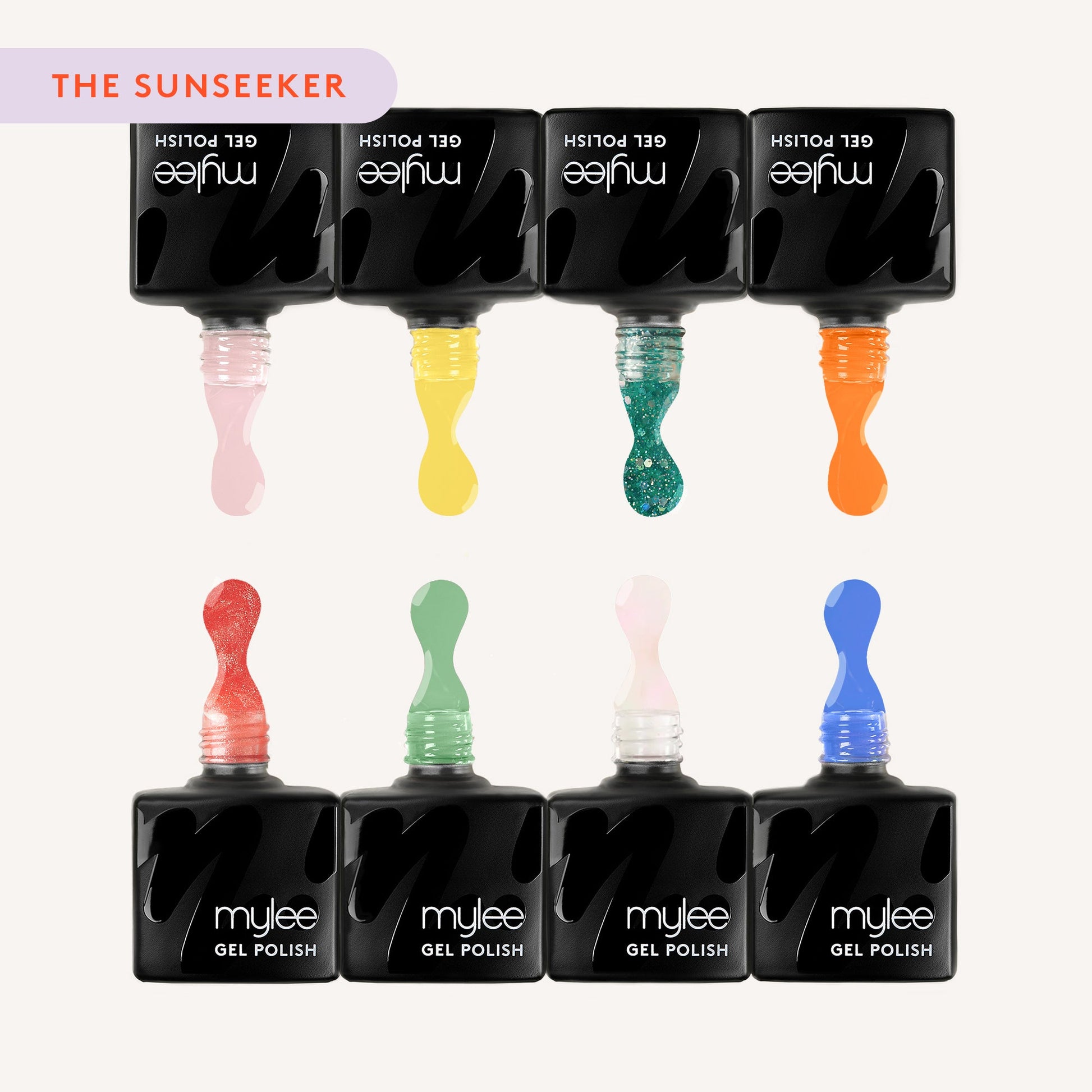 The Sun Seeker - Pistachio - pastel green, Pastel Chic - versatile neutral shade, Bluebell - rich blue, Lemon Squeeze - bright yellow, Safari Trip - pastel orange, Ibiza Sunset - peach orange, Genie In A Bottle - turquoise glitter, Seashell - pearlescent pink and purple colour.