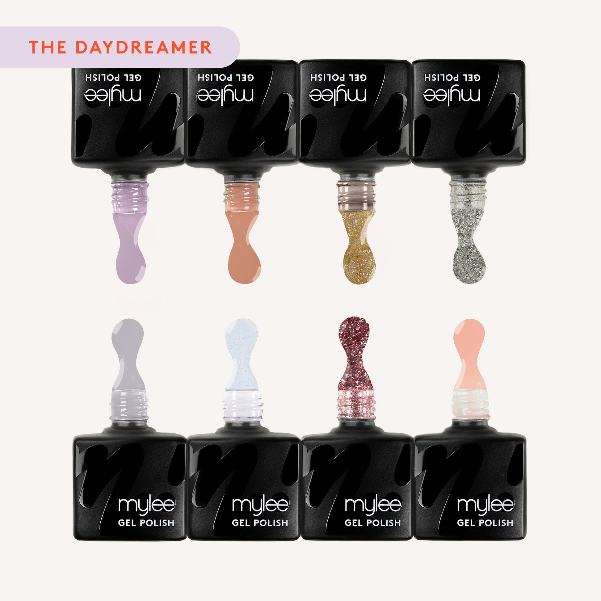 The Daydreamer - Quite Delightful - pale lilac, caramel - warm caramel nude, Fields of Gold - pale shimmery champagne gold, Show Time - chunky glitter nail polish in silver tones, Up My Street - light grey, Fountain of Youth - Mottled grey-blue, Copper Shine - rose gold glitters suspended in a clear polish base and Birth of Venus - light ballet pink with a creamy undertone.