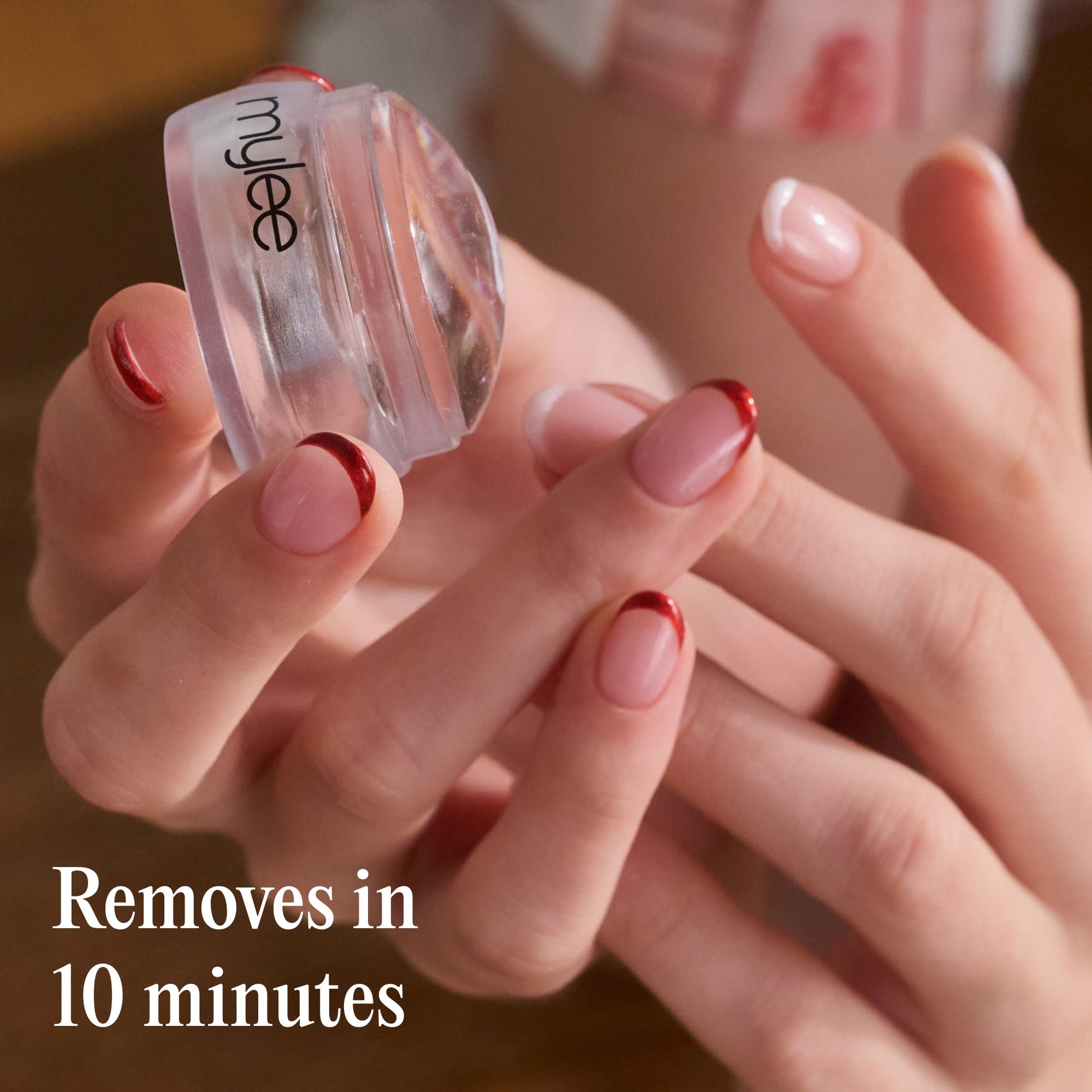 File nails to shape and use a Mylee Buffing Block* to gently remove shine from the nail plate. Wipe your nails with a dash of Mylee 2-in-1 Nail Prep & Wipe* on a Lint Free Wipe* to remove any oils. If you’re prone to lifting, apply the Mylee Dehydrator* followed by the Mylee Acid-Free Primer*.