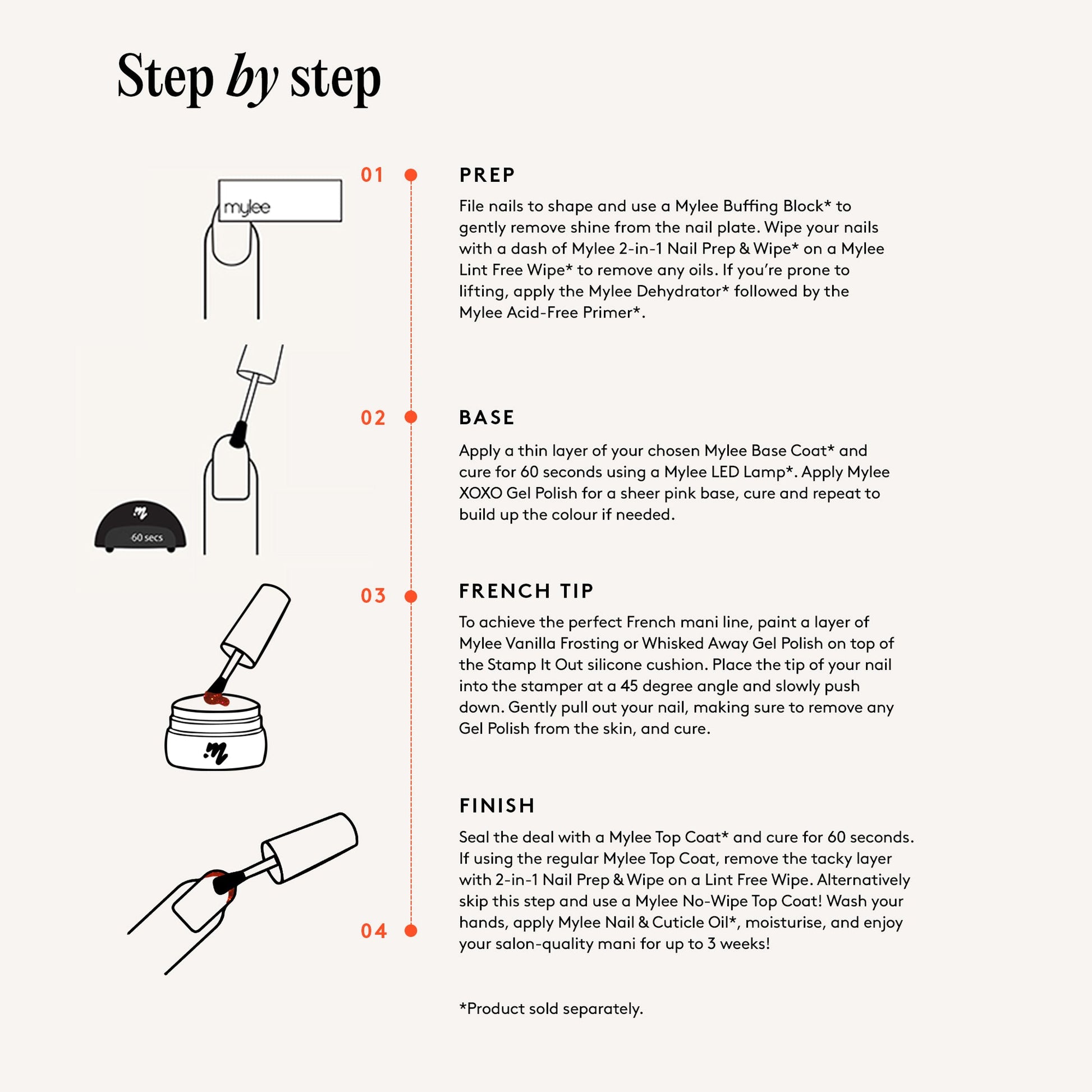 To achieve the perfect French mani line, paint a layer of Mylee Vanilla Frosting or Whisked Away Gel Polish on top of the Stamp It Out silicone cushion. Place the tip of your nail into the stamper at a 45 degree angle and slowly push down. Gently pull out your nail, making sure to remove any Gel Polish from the skin, and cure.