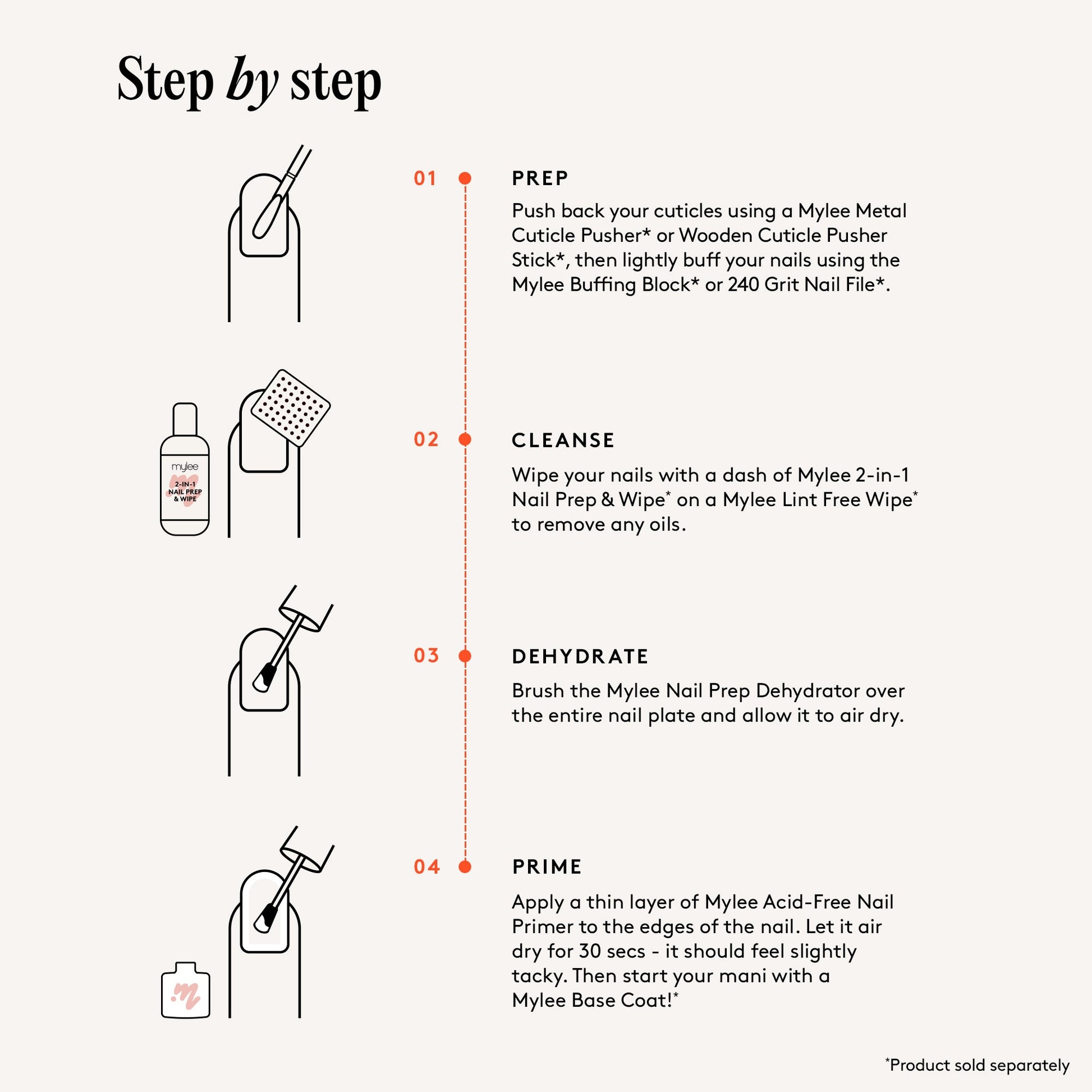 Apply a thin layer of Mylee Acid-Free Nail Primer to the edges of the nail. Let it air dry for 30 seconds - it should feel slightly tacky. Then start your mani with a Mylee Base Coat!*