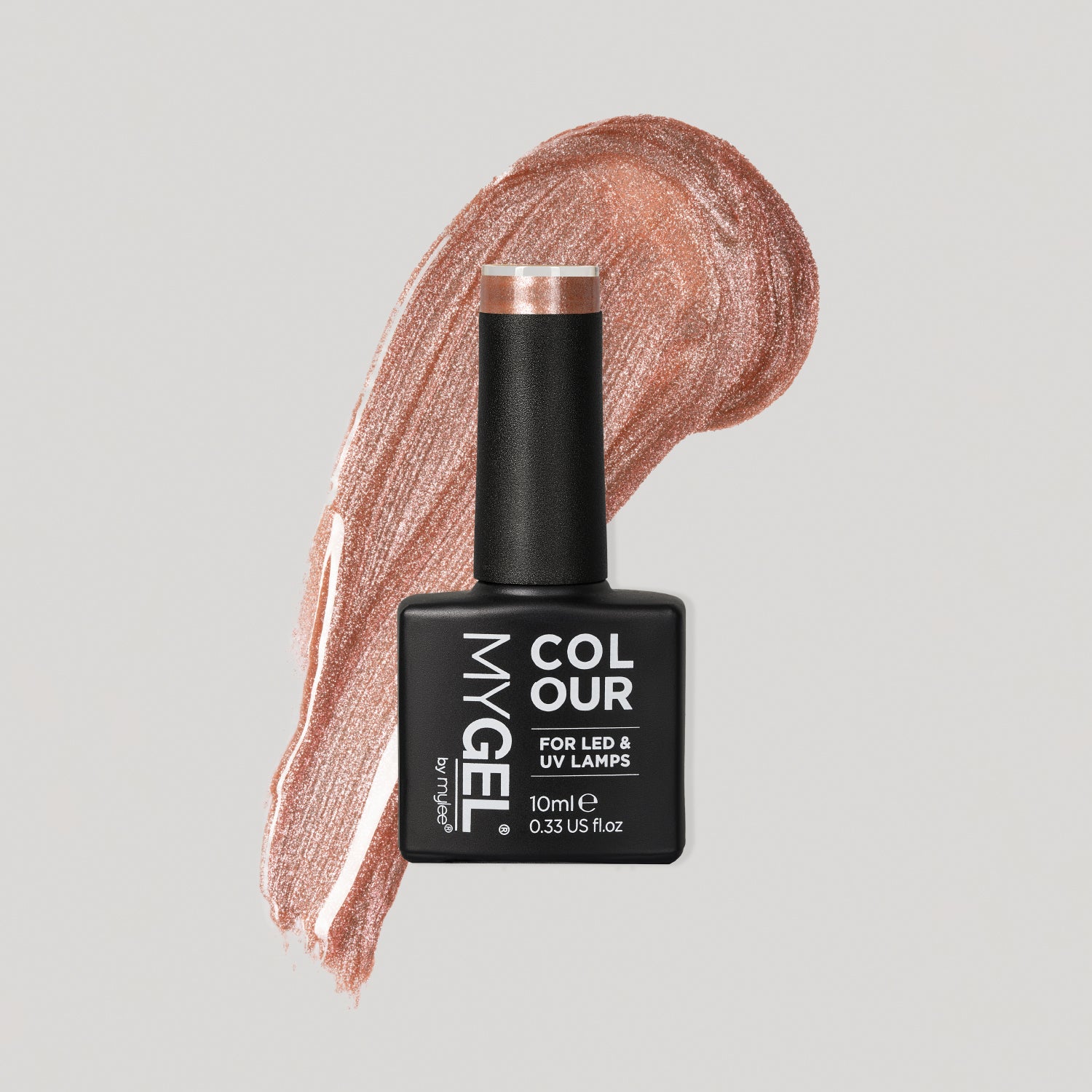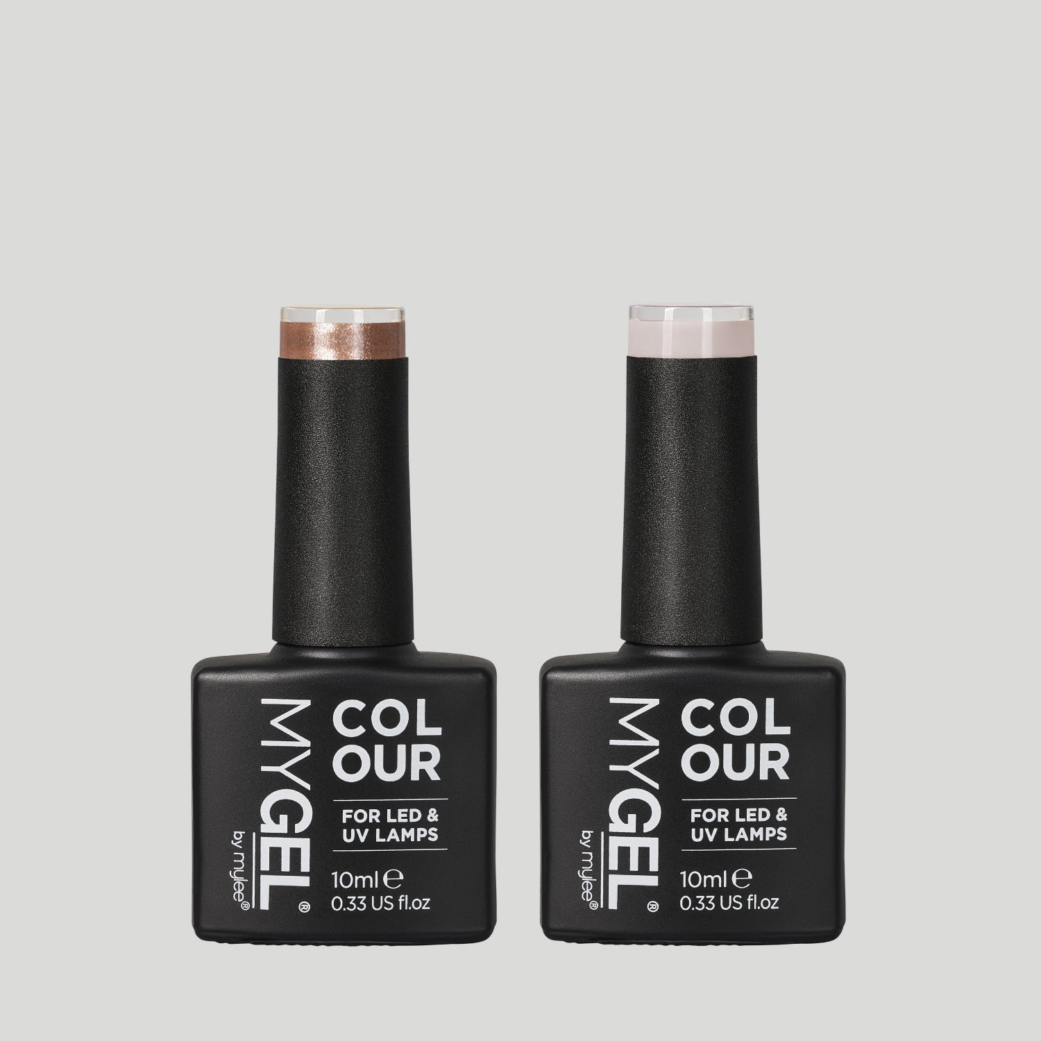Any nails you paint with this classic duo will surely be called a work of art! Containing Solo Act, a creamy taupe-hued nude, and Masterpiece, a shimmery bronze/champagne. Protect the polish from chipping and nicks with MyGel Base Coat and a glossy MyGel Top Coat and ensure a beautiful manicure that lasts up to 3 weeks! Cures under LED or UV Lamp.