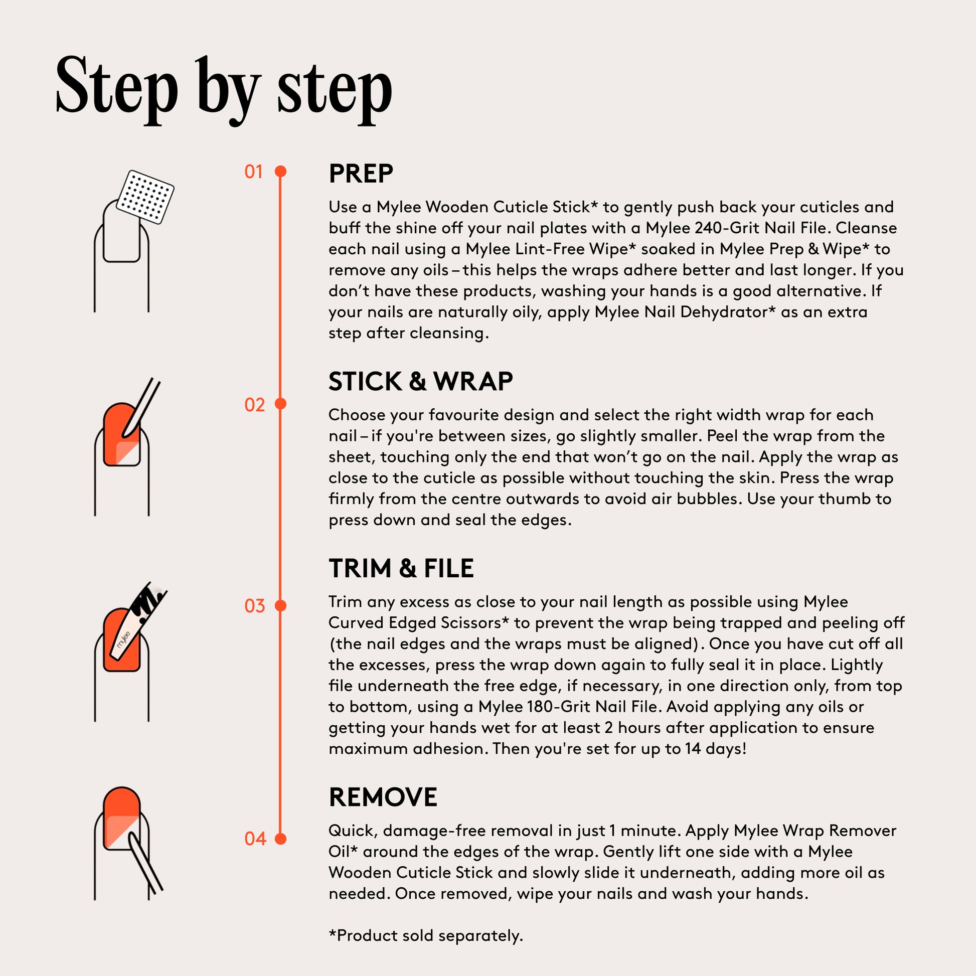 Quick, damage-free removal in just 1 minute. Apply Mylee Wrap Remover Oil around the edges of the wrap. Gently lift one side with a Wooden Cuticle Stick and slowly slide it underneath, adding more oil as needed. Once removed, wipe your nails and wash your hands.