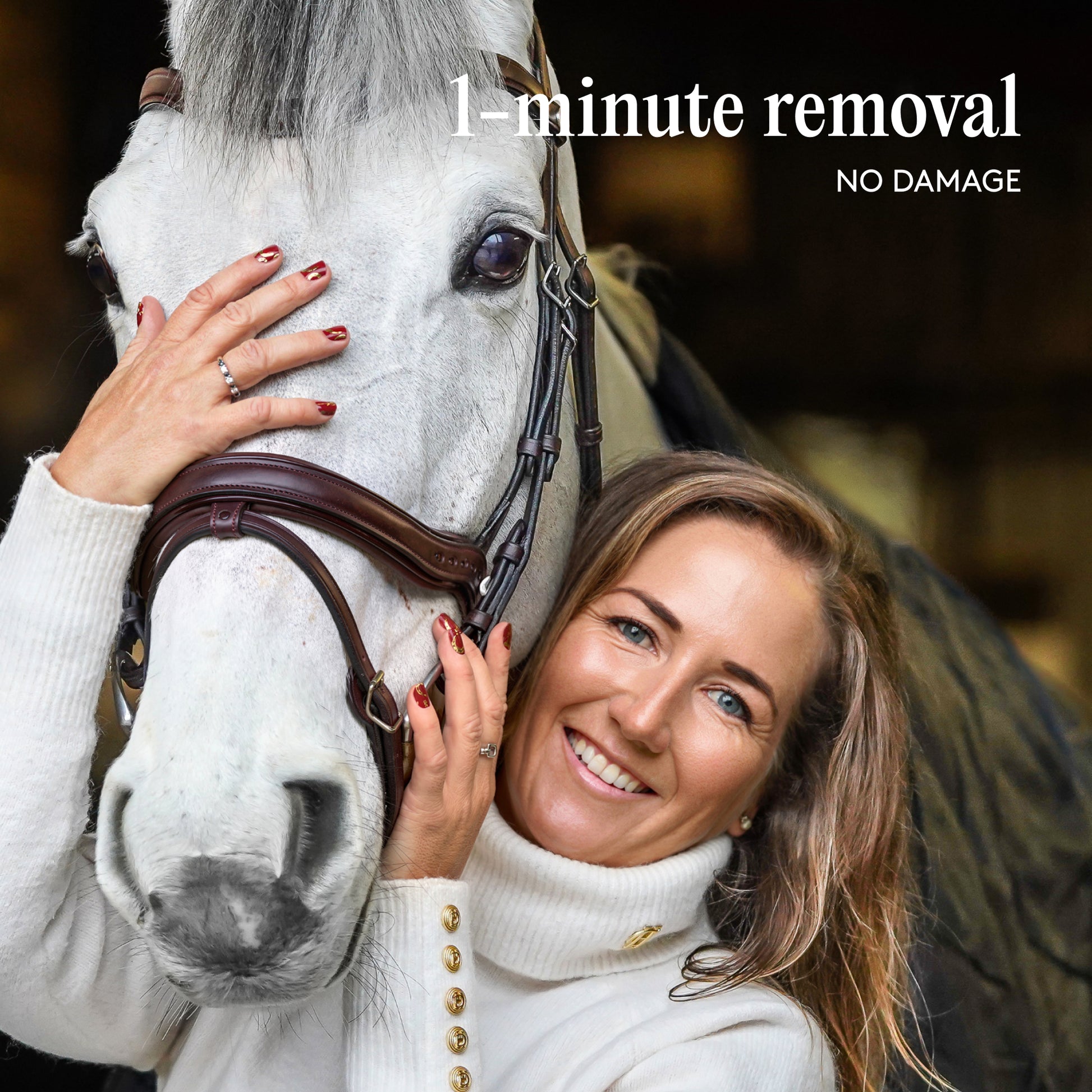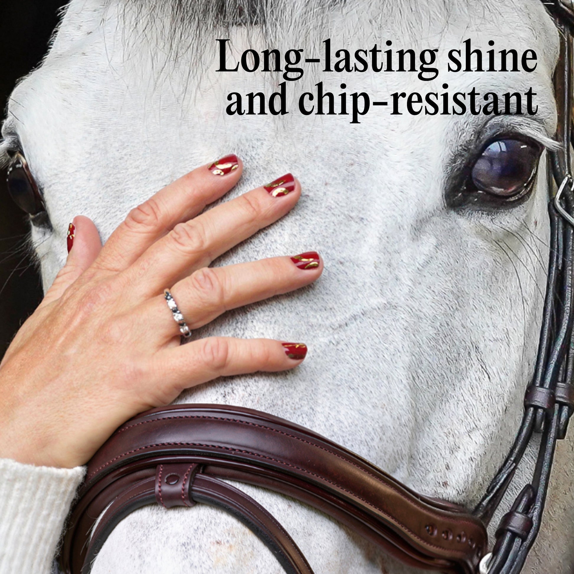 Designed in collaboration with Laura Collett, Olympic gold medallist and one of Britain’s most respected equestrian athletes, Golden Gallop Gel Nail Wraps bring winning energy to your mani. With a rich deep red base, gleaming gold foil accents, and lucky horseshoe nail art, it’s a bold look that feels confident and fun. Laura has chosen this design “because you need a lot of luck when it comes to horses and I’ve been very lucky to have had some special moments throughout my career and I’ve definitely had luck on my side!”